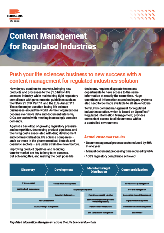 TerraLink’s content management for regulated industries solution provides world-class control for life science companies. By installing a single, highly scalable content repository businesses become instantly capable of effectively managing millions of documents – including text, spreadsheets and drawings.