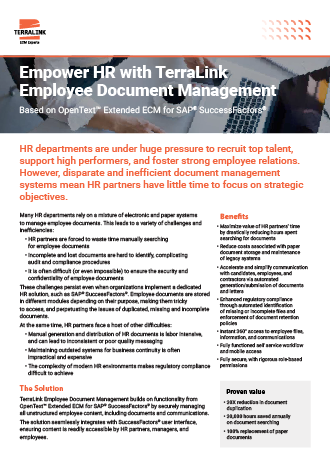 TerraLink’s Employee Document Management solution, which builds on the functionality of the OpenText™ Content Management (Extended ECM) platform, seamlessly integrates with SAP® SuccessFactors®. It delivers 360° access to all employee files and information, securely housing unstructured employee content and providing extensive search capabilities in a simple, easy to understand environment.